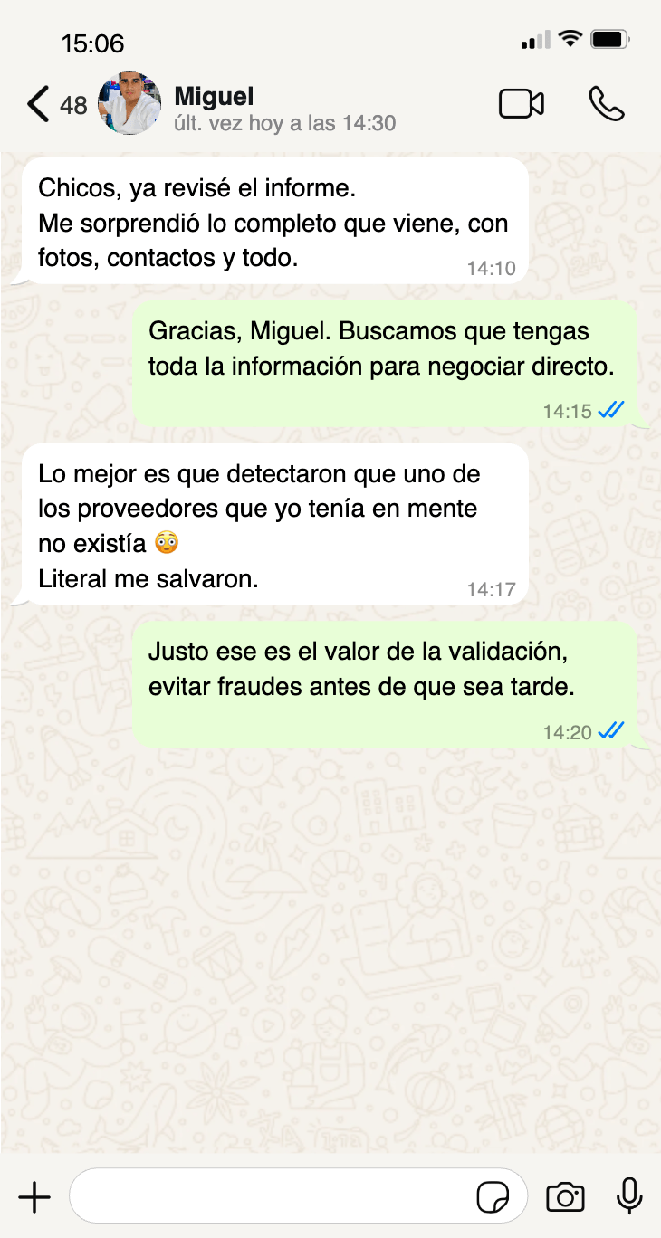 El reporte valida si la fábrica EXISTE, si su documentación es real y si su reputación es confiable.